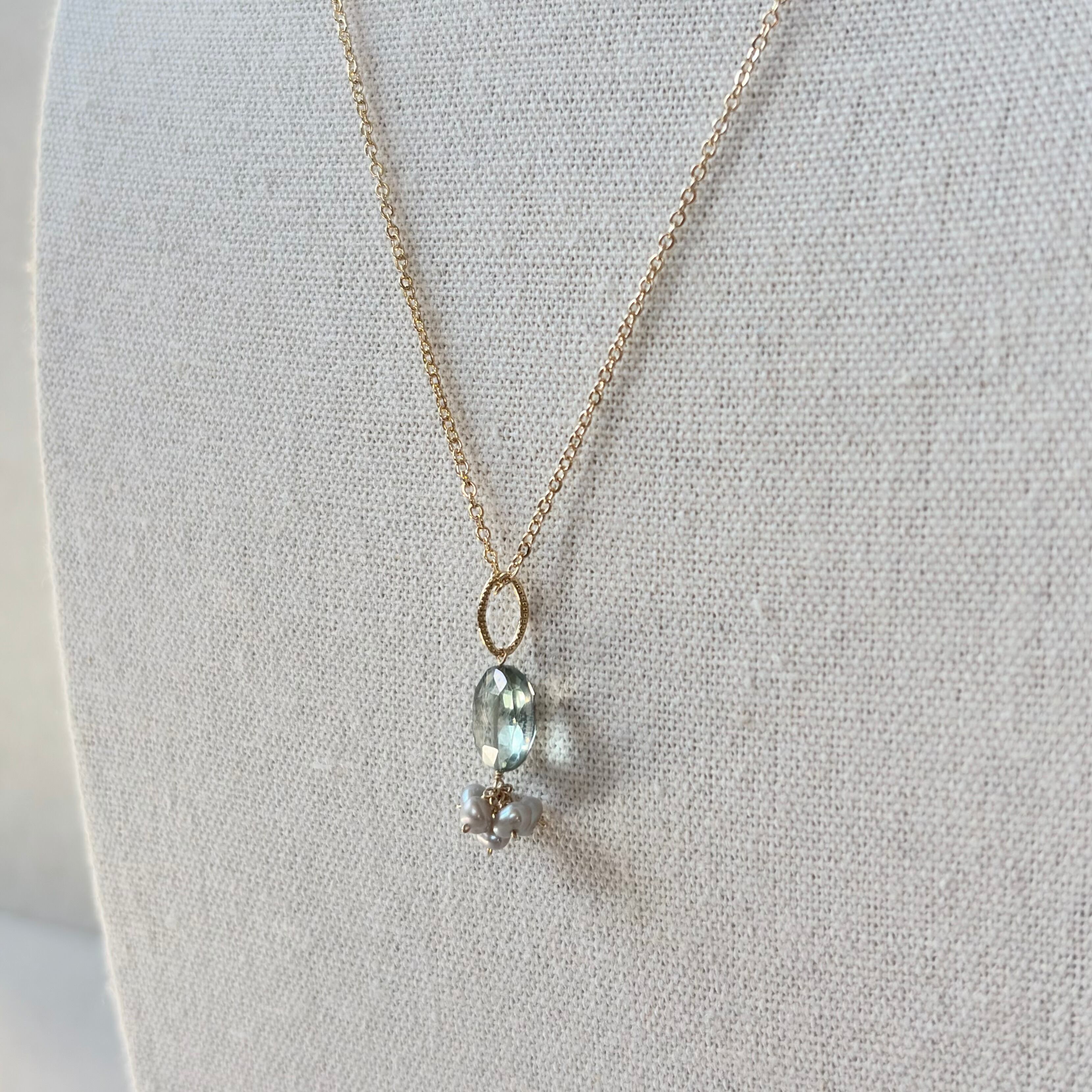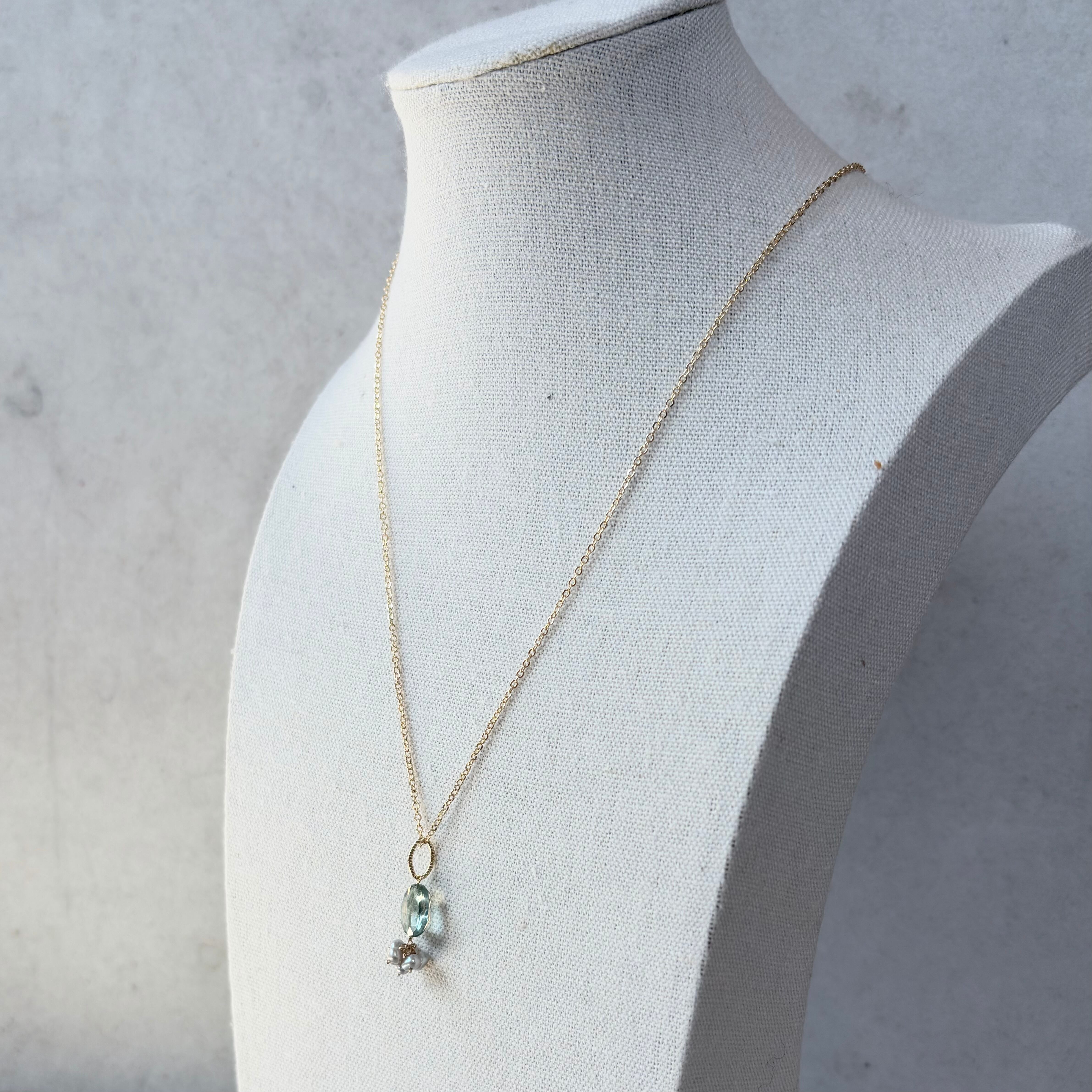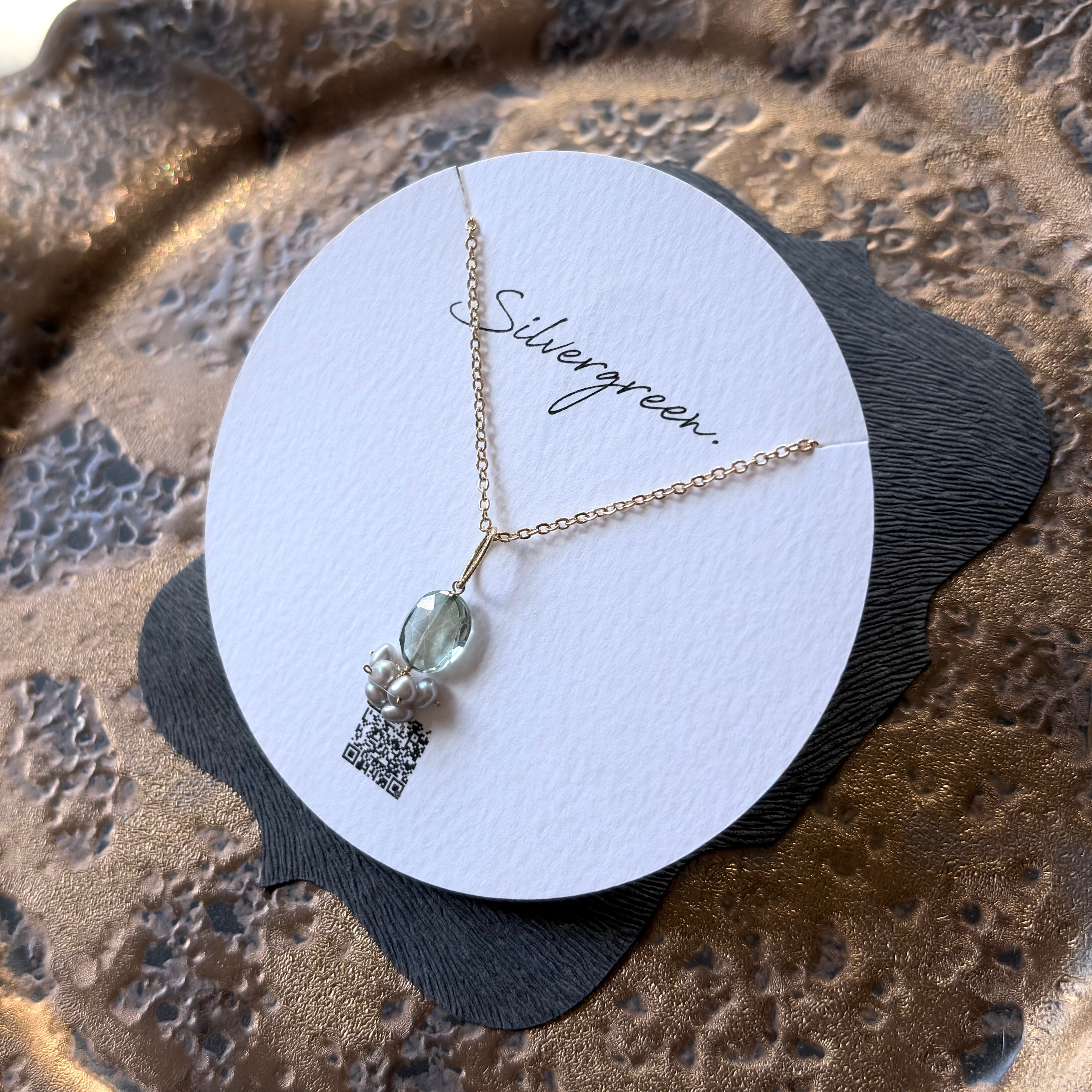 淡く澄んだグリーンのコーディングクリスタル(水晶)に、可憐なライトグレーの淡水パールを添えたネックレスです。