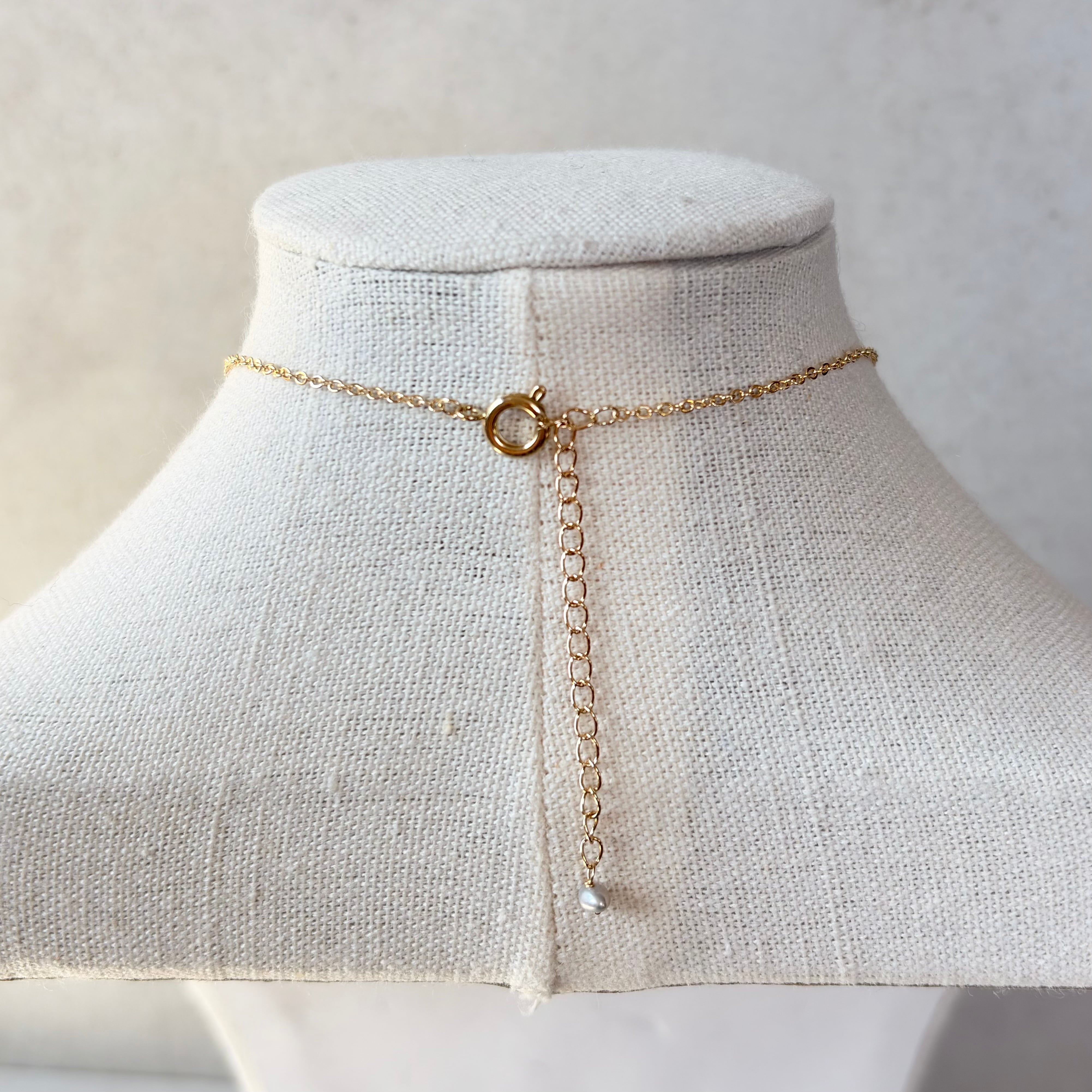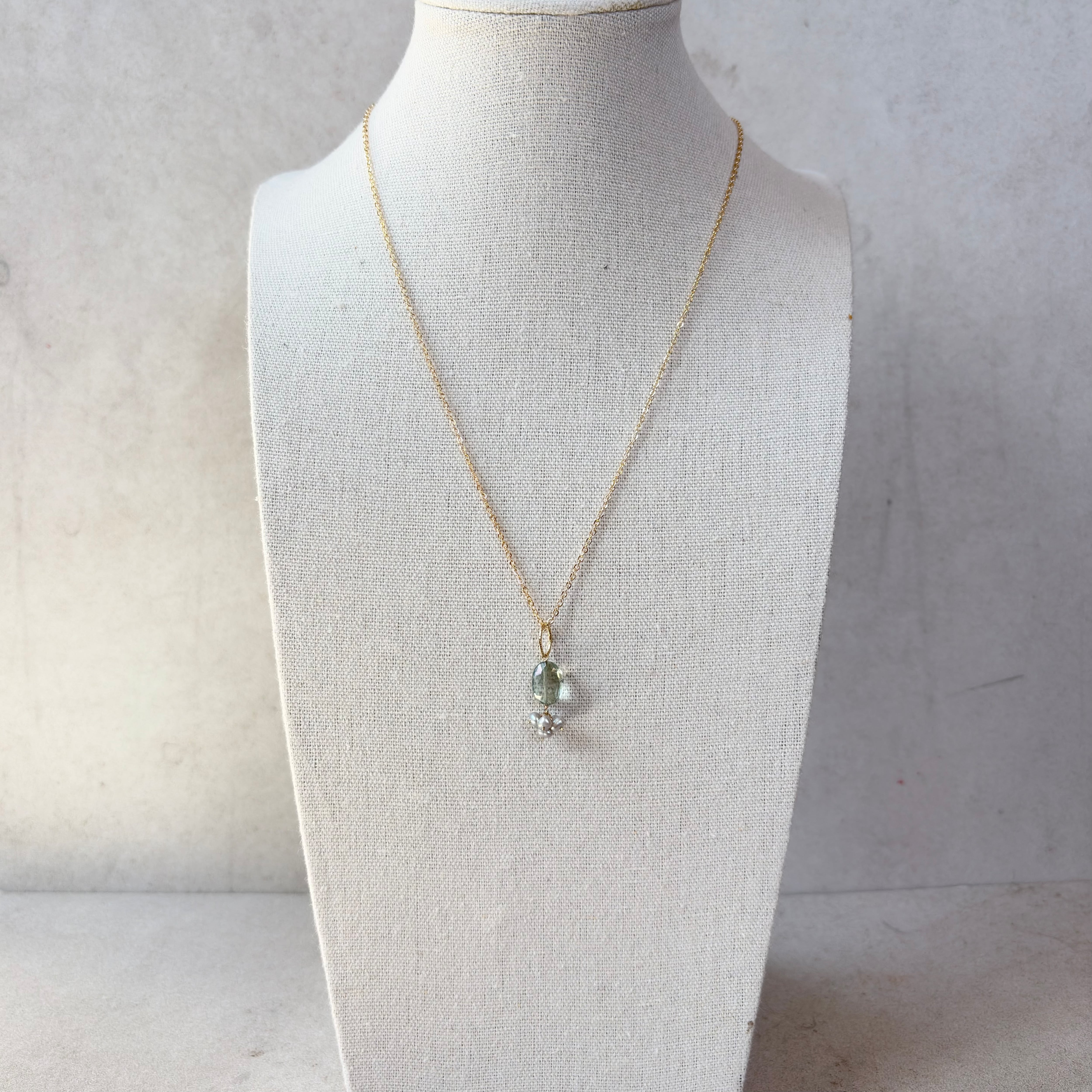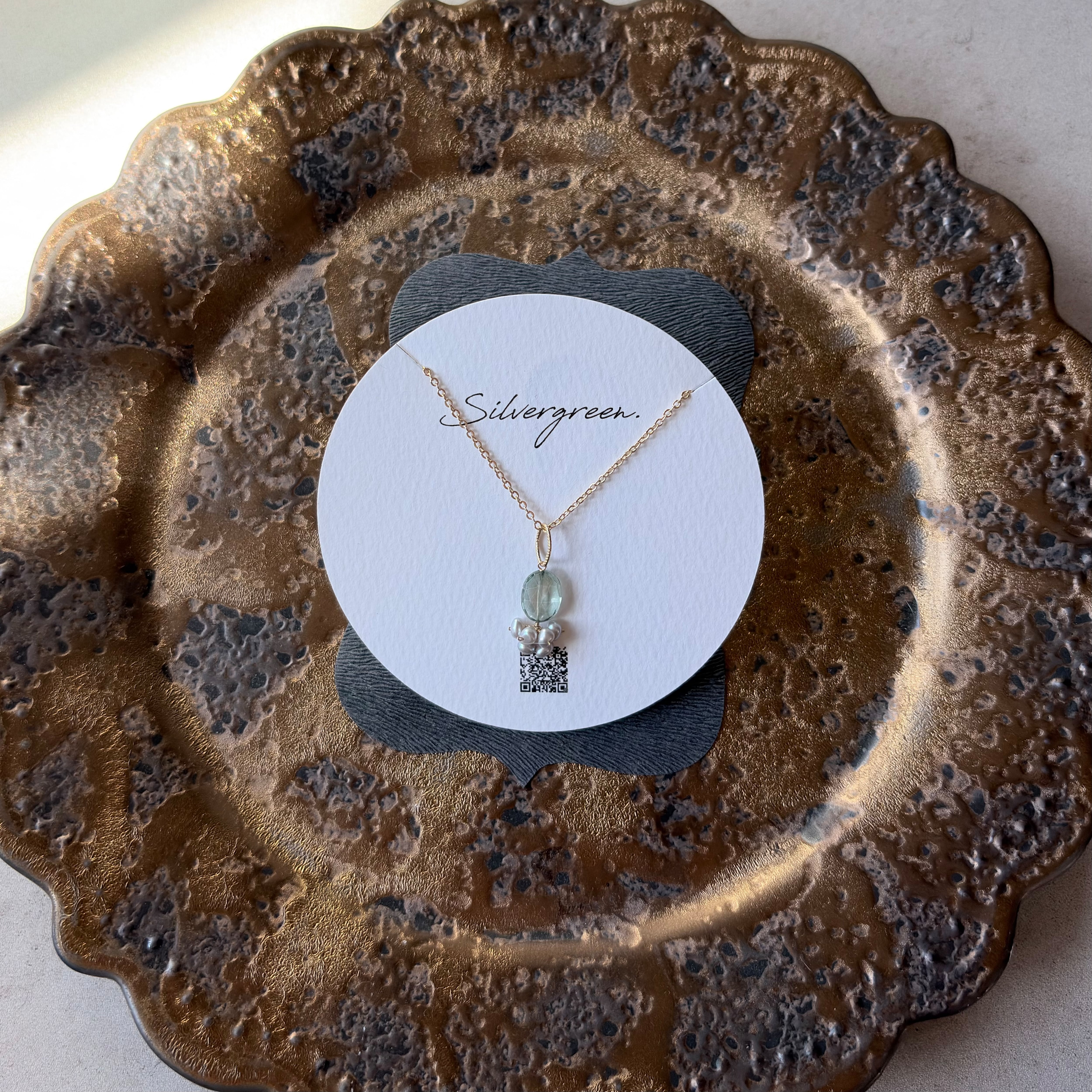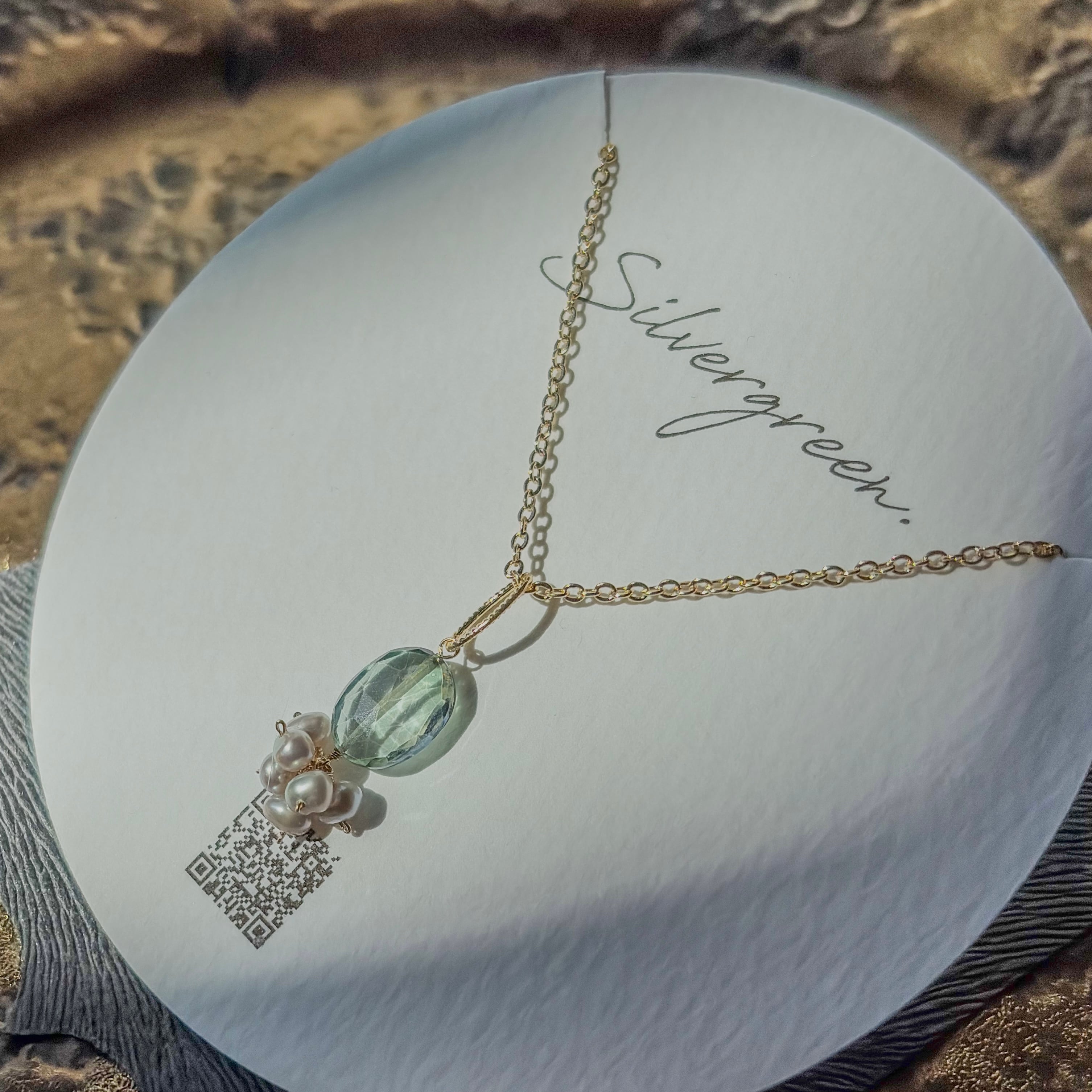 透明感をたたえた天然石は、光を受けるたびに内側からやわらかく輝き、その下で寄り添うパールが、静かな気品を添えます。