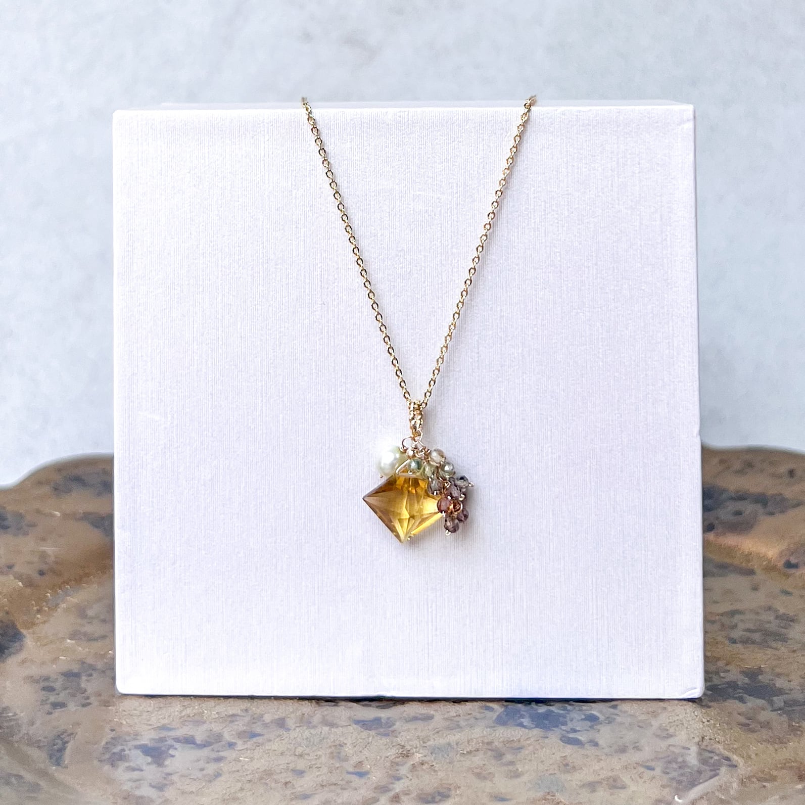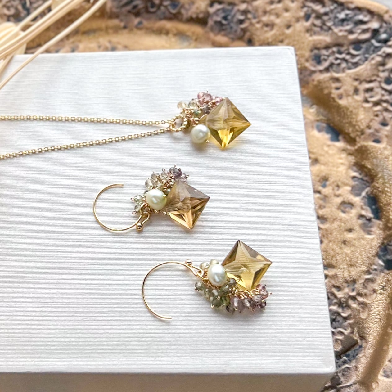 高品質で丁寧なカットが施されたシャンパンクォーツと小粒のマルチスピネル、淡水パールを使ったピアスとネックレスのセットです。
